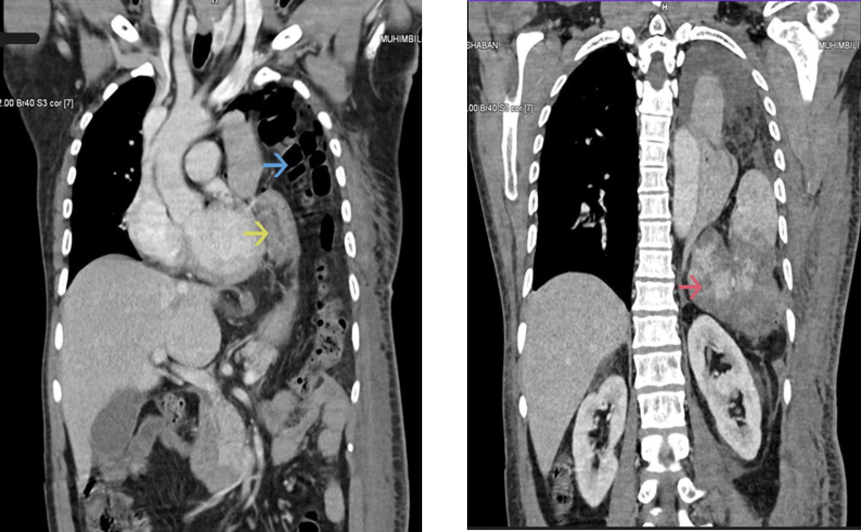 Conclusion: This case highlights the critical need for a high index of suspicion and comprehensive evaluation in cases of high-energy trauma, emphasizing the importance of detailed examination and cross-sectional imaging in detecting overlooked injuries. The patient’s hemodynamic stability, despite a shattered spleen, may have resulted from the compressive effect of the hernia defect on the splenic vessels, a factor that could play a role in similar trauma cases.