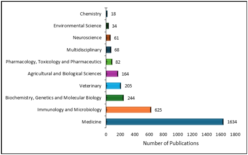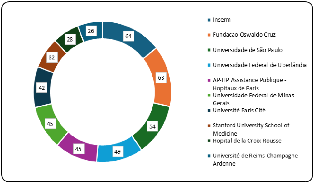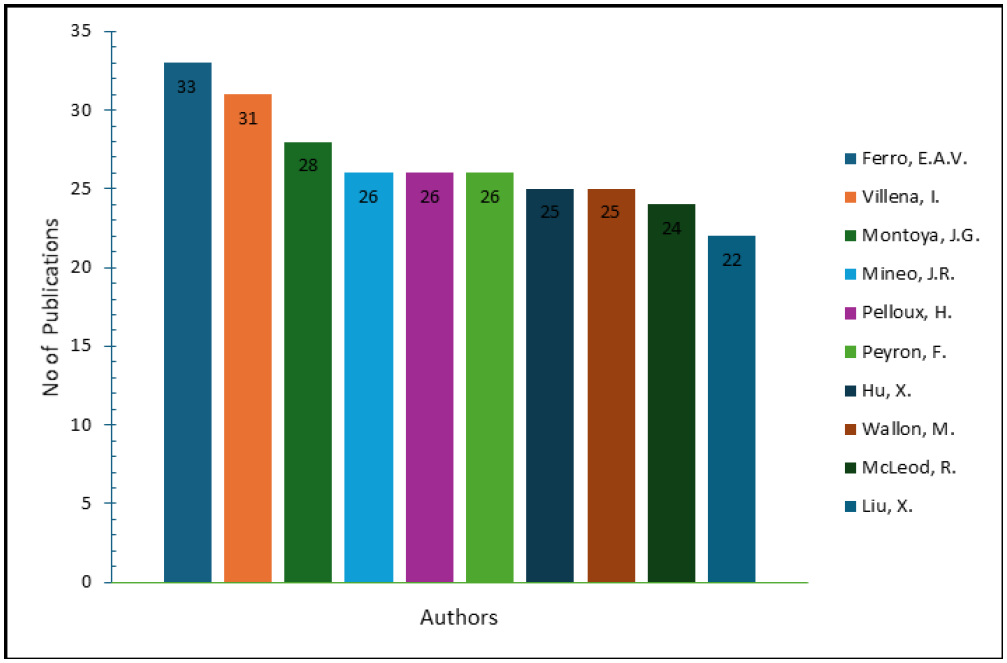 Results: A total of two thousand and one hundred (2100) publications on congenital toxoplasmosis and toxoplasmosis during pregnancy were indexed in Scopus between 2013 and 2023. Ferro E.A.V. (n=33), Villena I. (n=31), and Montoya J.G. (n=28) were the top three researchers with the most published scientific publications. A total of 134 countries contributed to congenital toxoplasmosis and pregnancy toxoplasmosis studies. The USA had the highest number of publications (n = 428) on congenital toxoplasmosis, followed by Brazil with 330 publications. Most publications were published between 2021 (n=235) and 2022 (n=245). Inserm (n=64), Fundacao Oswaldo Cruz (n=63), and Universidade de São Paulo (n=54) had the highest research output.