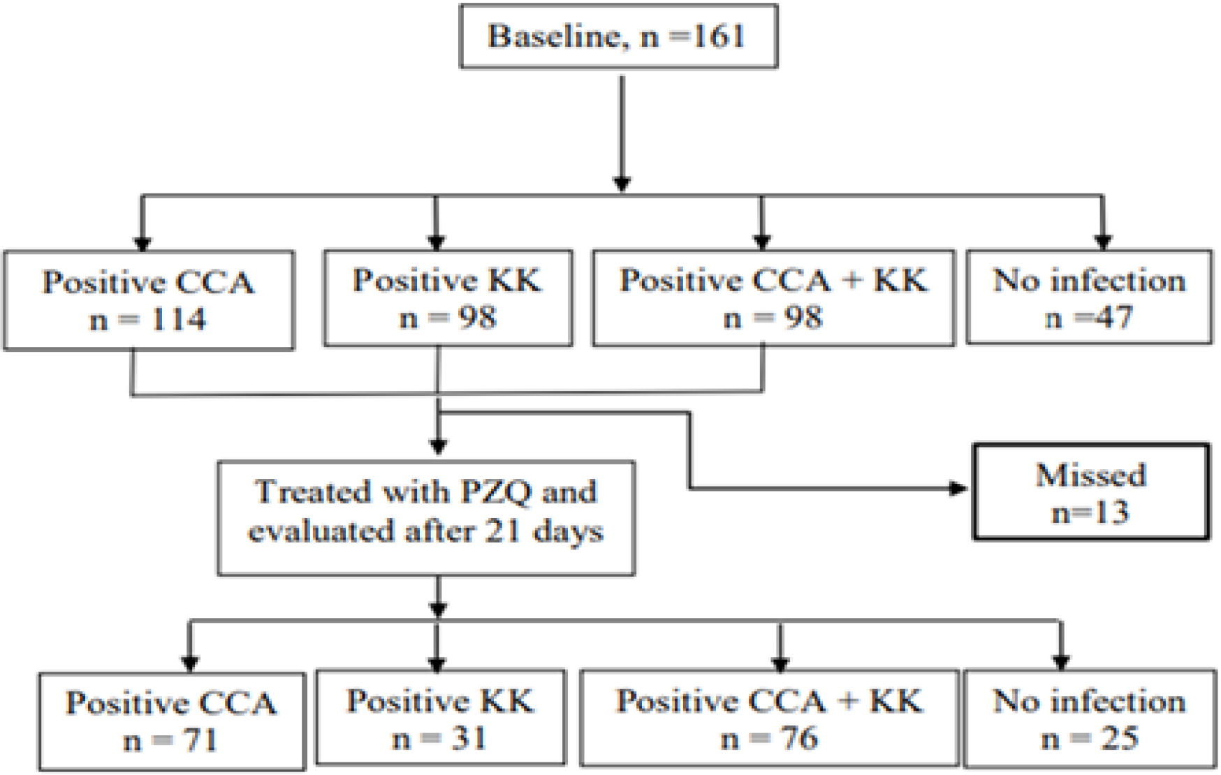 Methods: A longitudinal study was conducted among 161 children aged 2–17 years. Participants were screened for S. mansoni infection using Kato-Katz and POC-CCA tests at baseline and 21 days post-treatment with a single dose of PZQ (40 mg/kg). Cure rates (CR) and egg reduction rates (ERR) were calculated.