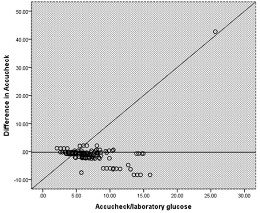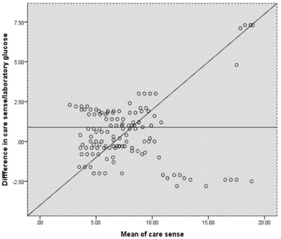 Methods: This cross-sectional study involved 125 diabetic patients aged 39-59 years old comprised of 56 (47%) males and 69 (55.2%) females recruited from November 2022 to January 2023 at Muhimbili National Hospital Emergency Medicine Department. Patients’ demographic and other relevant information were recorded using a questionnaire along with glucometer readings and the laboratory values of glucose. Bland Altman graphs, ISO 15197:2013, Consensus Grid Reference, were used to assess the technical and clinical accuracies.
