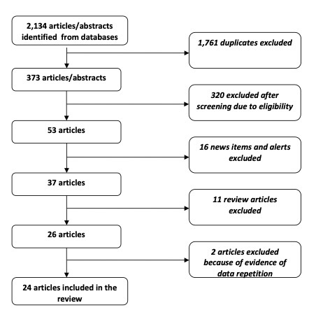 articles (11 case series, 9 case reports, and 4 others) were found to be
