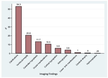 calcifications of brain tissue (n=240, 54.3%), ventriculomegaly (n=93,