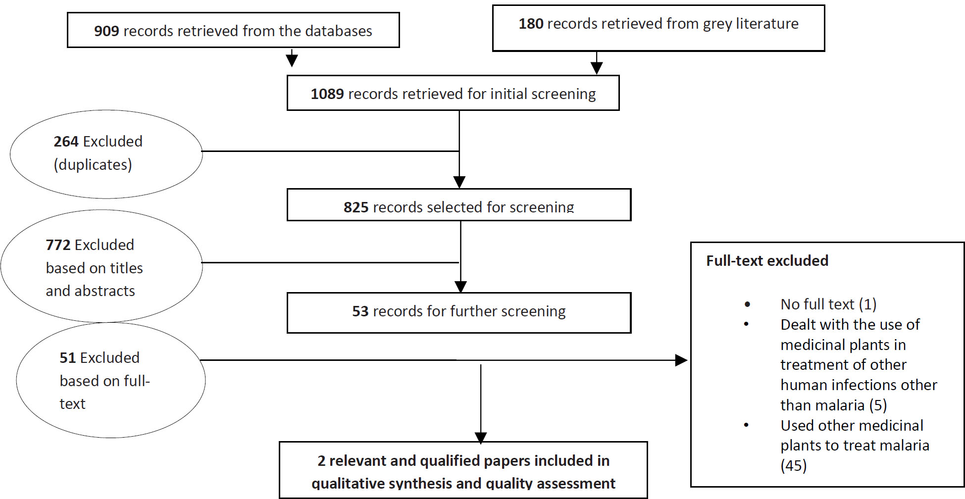 Results: Out of the total 1089 articles retrieved, only 3 fitted the inclusion criteria, 1 article could not be retrieved. A narrative synthesis was therefore done on 2 final research articles that were retrievable. The pooled evidence shows that Azadirachta indica is effective against malaria. The medicinal effects are more on symptoms and curbing development to clinical disease than ant parasitic effects.