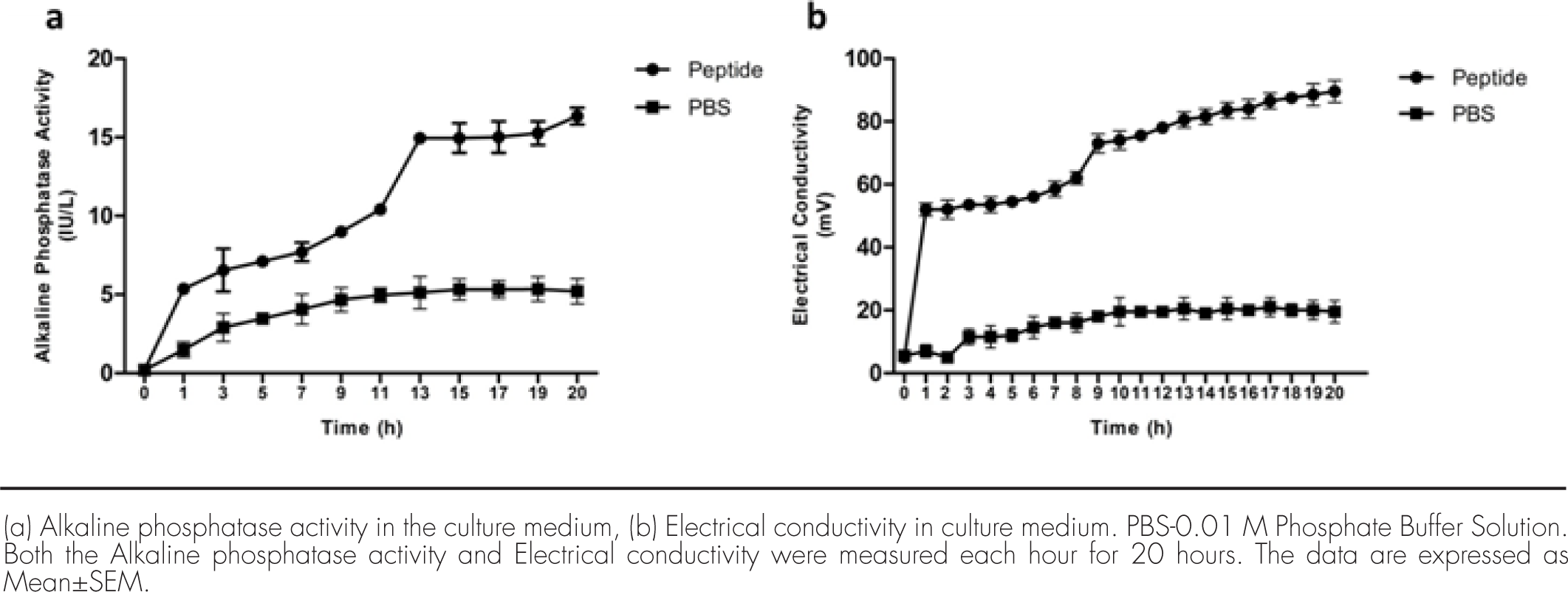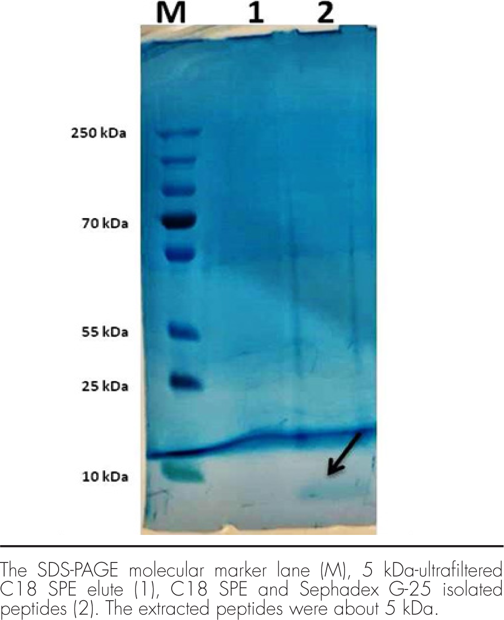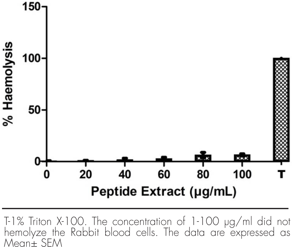 Results: The peptides were found to be about 5 kDa molecular weight with, ability to damage the bacterial cell envelope causing significant leakage in periplasmic alkaline phosphatase enzyme and cytoplasmic electrolytes. Even at the highest peptide extract concentration of 100 μg/mL, no significant hemolysis was observed on the fresh rabbit blood cells [3.63%;P>.05], signifying their safety on normal mammalian cells.