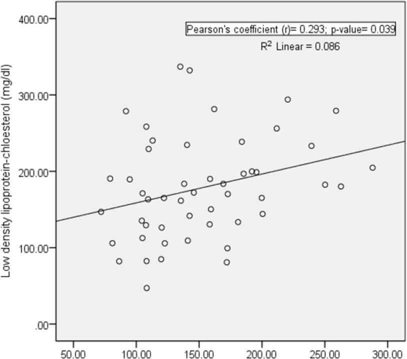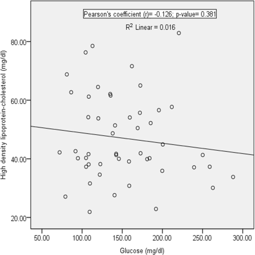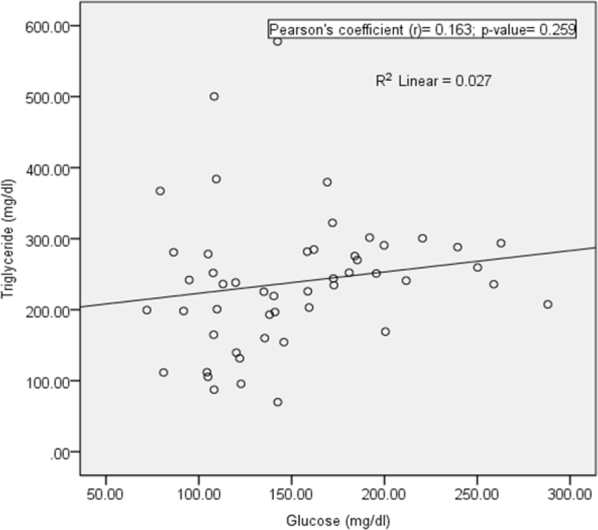 Results: A significant association was noted between the BMI and hyper TC (X2 = 9.936; p =.001), hyper TG (X2 = 10.761; p = .001), and hyper LDL-C (X2 = 10.410; p = .001), whereas the association was not significant with low HDL-C (X2 = 2.416; p = .137). A positive significant correlation was noticed between blood glucose and TC (r = 0.678, p = 0.000) and between blood glucose and LDL-C (r = 0.293, p = .039). A positive no-significant association was noted between blood glucose and TG (r = 0.163, p = .259), whereas a negative no-significant link was between blood glucose and decreased HDL-C (r = -0.126 p = .381).